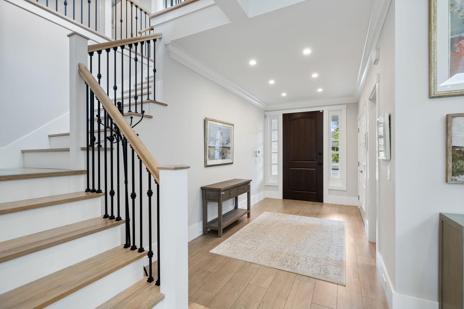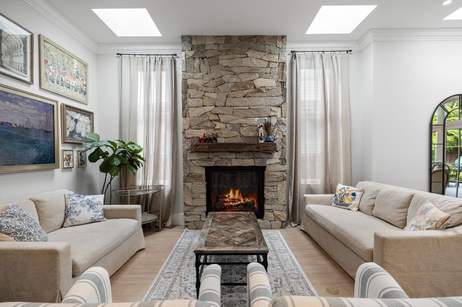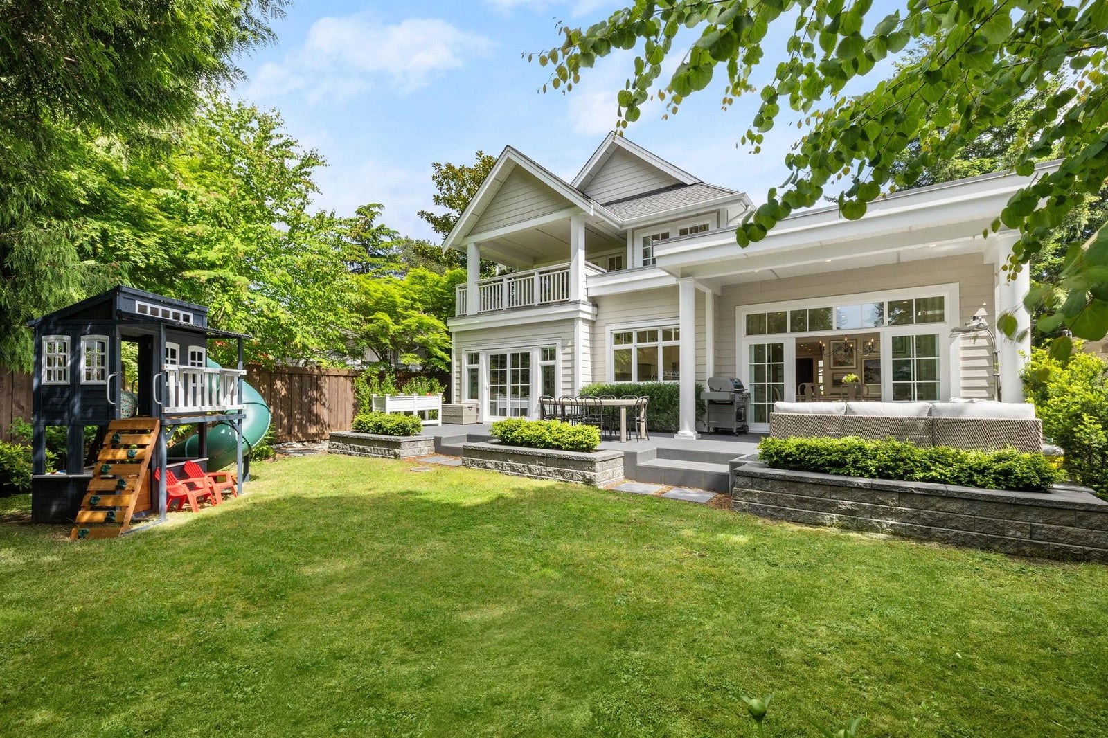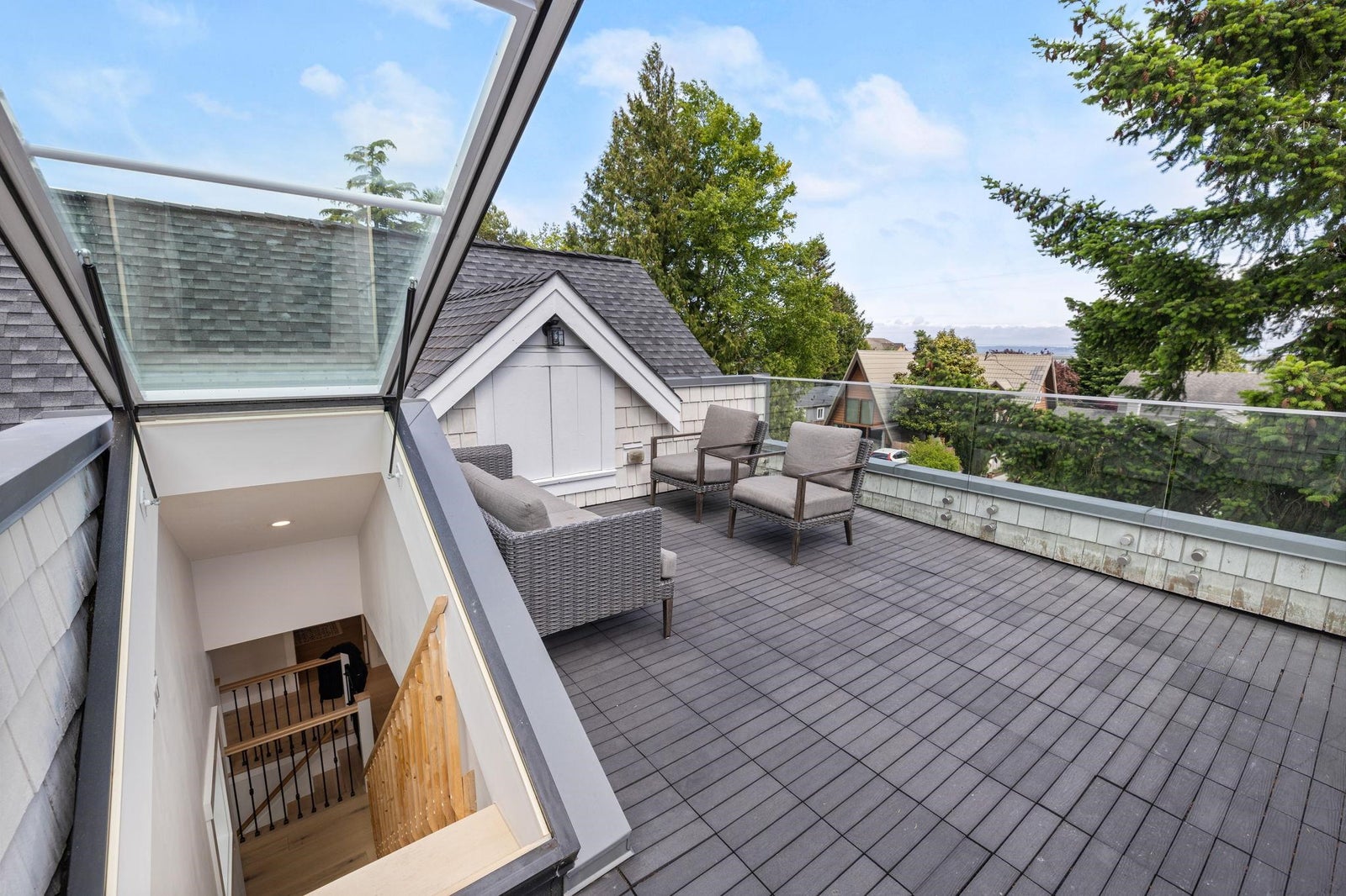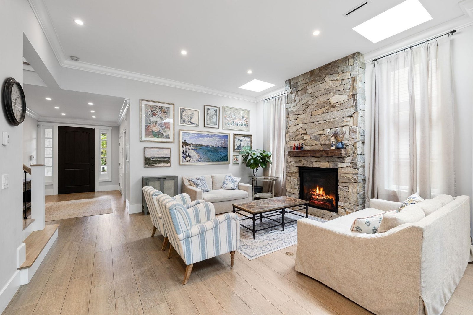 This one-of-a-kind residence offers exceptional craftsmanship and a seamless blend of indoor and outdoor living. Meticulously designed, this 2,731 sq. ft. home features an open-concept floor plan with soaring 11-ft ceilings, creating an airy and expansive atmosphere. Timeless stone finishes add elegance throughout. A large, covered deck off the living room extends the living space outdoors, perfect for entertaining or relaxing. Enjoy breathtaking ocean views stretching to White Rock from the private rooftop deck. The home offers two luxurious primary bedrooms, each with a spa-inspired ensuite. A striking floor-to-ceiling stone fireplace anchors the living area, while in-floor heating ensures year-round comfort. Downstairs guest/in-law suite with bathroom and separate entrance.