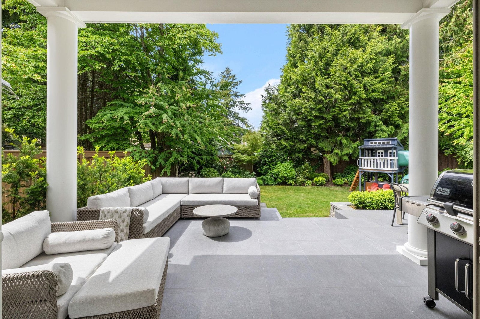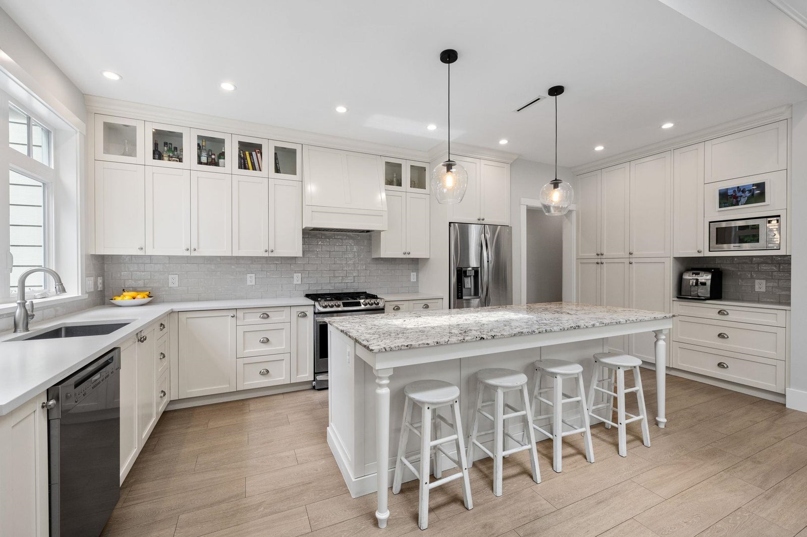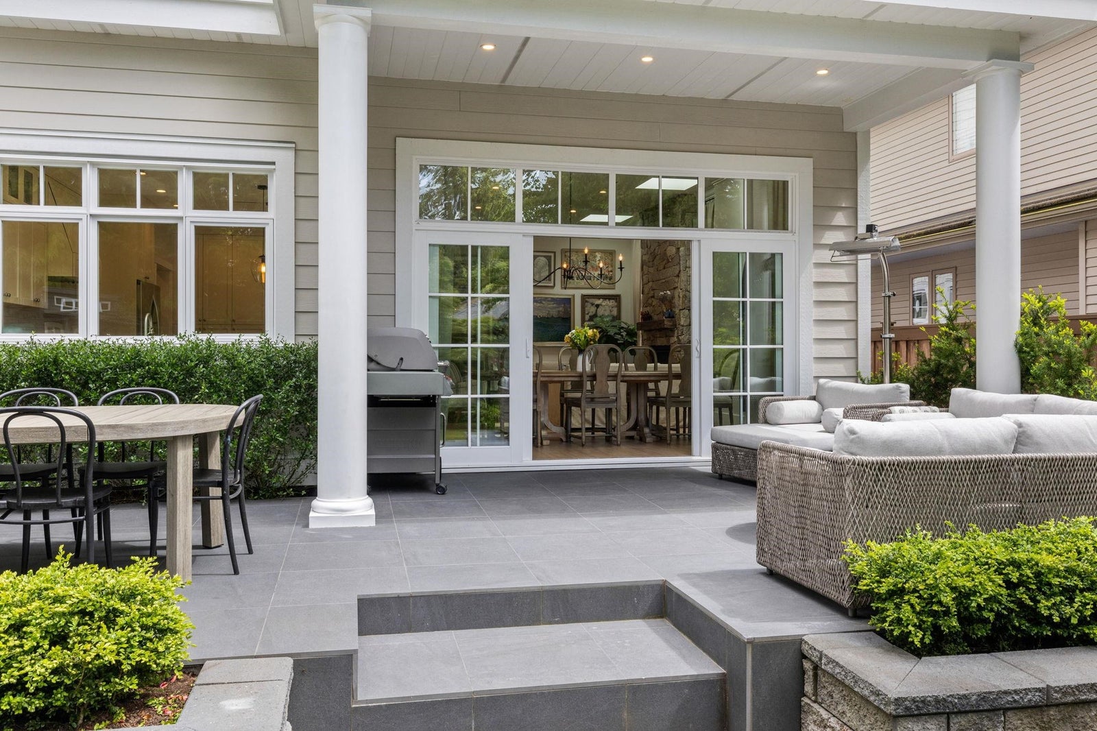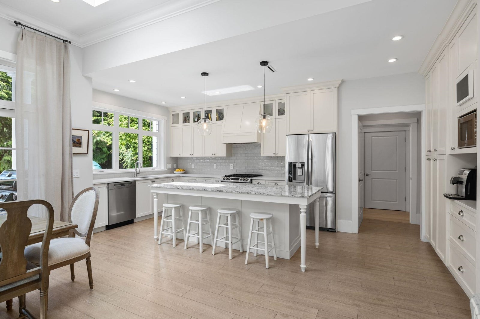 This one-of-a-kind residence offers exceptional craftsmanship and a seamless blend of indoor and outdoor living. Meticulously designed, this 2,731 sq. ft. home features an open-concept floor plan with soaring 11-ft ceilings, creating an airy and expansive atmosphere. Timeless stone finishes add elegance throughout. A large, covered deck off the living room extends the living space outdoors, perfect for entertaining or relaxing. Enjoy breathtaking ocean views stretching to White Rock from the private rooftop deck. The home offers two luxurious primary bedrooms, each with a spa-inspired ensuite. A striking floor-to-ceiling stone fireplace anchors the living area, while in-floor heating ensures year-round comfort. Downstairs guest/in-law suite with bathroom and separate entrance.